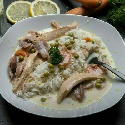 Hühnerfrikassee Erbsen und Karotten