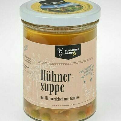 65 % Hühnerbrühe (Trinkwasser, Suppenhühner, Möhren, Lauch, Sellerie, Meersalz, Liebstock),